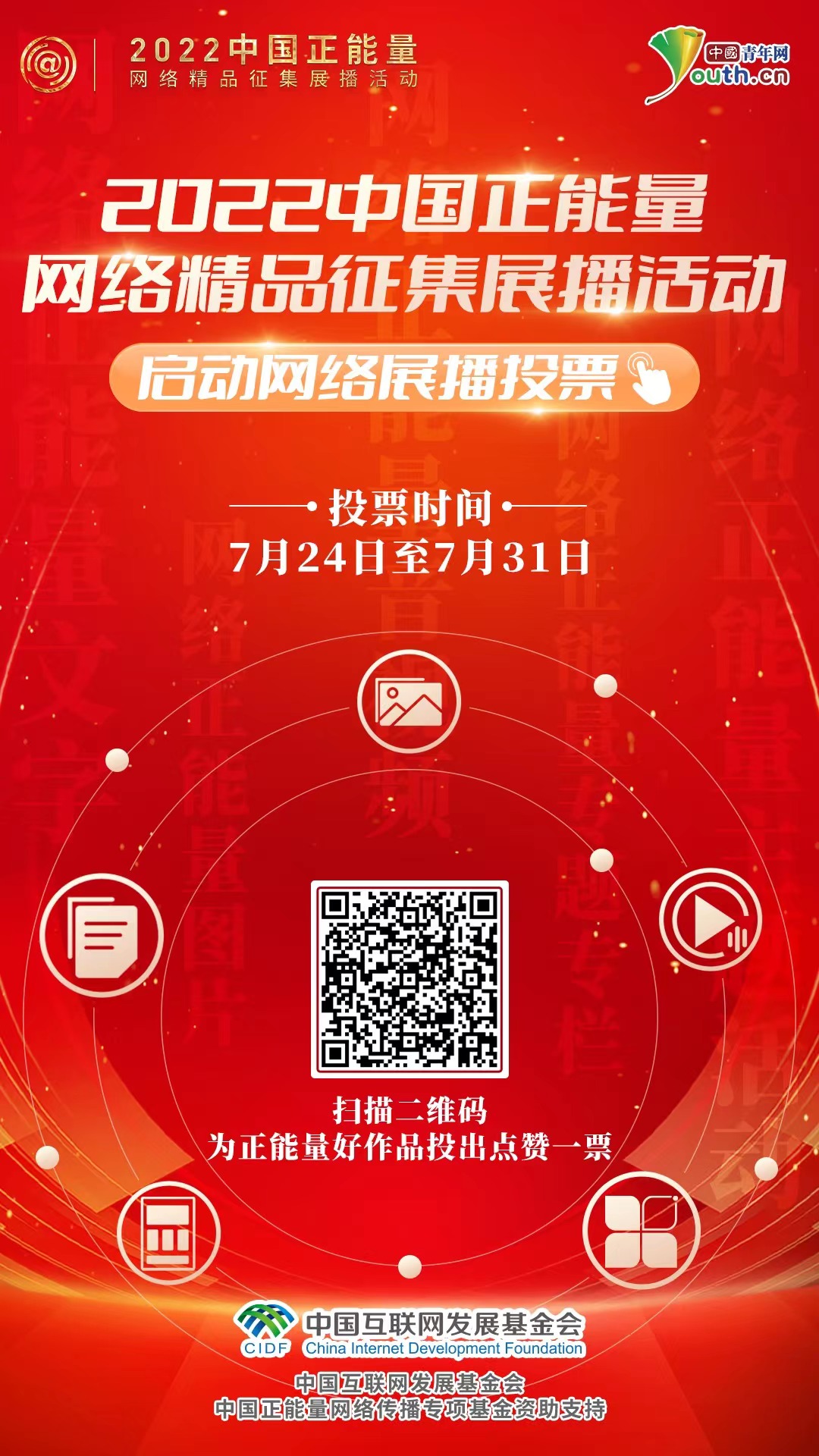 團結(jié)奮進新征程,同心奮斗創(chuàng)偉業(yè)。由中央網(wǎng)信辦主辦的2022中國正能量網(wǎng)絡(luò)精品征集展播活動已正式啟動網(wǎng)絡(luò)展播投票。網(wǎng)絡(luò)正能量文字、網(wǎng)絡(luò)正能量圖片、網(wǎng)絡(luò)正能量音視頻、網(wǎng)絡(luò)正能量專題專欄、網(wǎng)絡(luò)正能量主題活動,約1100件正能量好作品匯聚網(wǎng)絡(luò)空間,歡迎廣大網(wǎng)友掃描二維碼關(guān)注作品、參與投票,讓“大流量”澎湃正能量。(劉尚君 潘曉文 朱鈞有)
