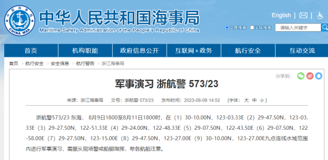 據(jù)中國海事局網(wǎng)站消息,浙江海事局發(fā)布航行警告,8月9日18時至8月11日18時,東海部分海域進(jìn)行軍事演習(xí),需服從現(xiàn)場警戒船艇指揮,希各航船注意。