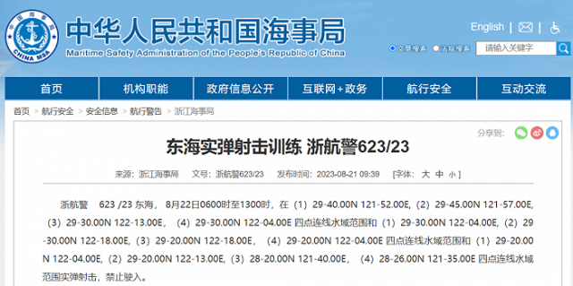 央視網(wǎng)消息:據(jù)中國(guó)海事局網(wǎng)站消息,浙江海事局發(fā)布航行警告,8月22日06時(shí)至13時(shí),東海部分水域范圍實(shí)彈射擊,禁止駛?cè)搿?/p>