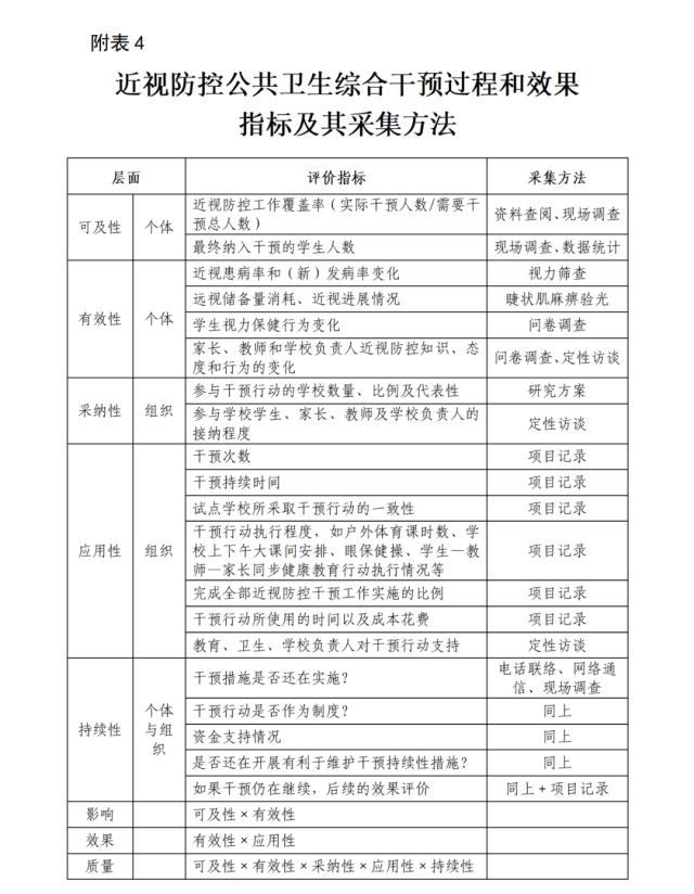 2.注重過程與效果評價。各級疾控機(jī)構(gòu)要定期開展學(xué)生視力監(jiān)測工作,深入分析歷年監(jiān)測數(shù)據(jù),將監(jiān)測發(fā)現(xiàn)的主要學(xué)生健康問題和建議及時報告當(dāng)?shù)卣?。基于實施性研究方法,從理論向?qū)嵺`進(jìn)行轉(zhuǎn)化和應(yīng)用,可推進(jìn)干預(yù)行動的實施與傳播。進(jìn)行過程與效果評價,引入實施性研究框架和理論模型,如近視防控公共衛(wèi)生綜合干預(yù)過程和效果指標(biāo)及其采集方法(附表4),從個體層面和組織層面全面評價干預(yù)行動的可及性、有效性、應(yīng)用性、可持續(xù)性,系統(tǒng)性地評估兒童青少年近視公共衛(wèi)生綜合干預(yù)的實施成效。