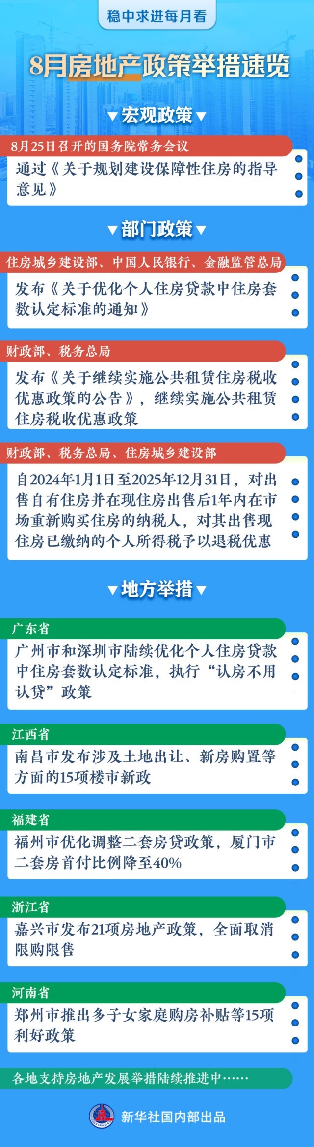 近段時間,相關(guān)部門陸續(xù)釋放地產(chǎn)領(lǐng)域積極政策信號:8月初,中國人民銀行在部署下半年工作時明確提出“繼續(xù)引導個人住房貸款利率和首付比例下行”;近日,住房城鄉(xiāng)建設(shè)部等三部門給出了“認房不認貸”政策具體實施標準;財政部還公布了兩項針對房地產(chǎn)市場的稅收優(yōu)惠政策。