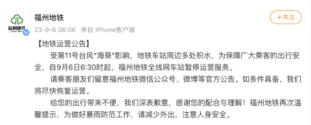央視網(wǎng)消息:據(jù)@福州地鐵 微博消息,受第11號臺風(fēng)“??庇绊?,地鐵車站周邊多處積水,為保障廣大乘客的出行安全,自9月6日6:30時(shí)起,福州地鐵全線網(wǎng)車站暫停運(yùn)營服務(wù)。如條件具備,將盡快恢復(fù)運(yùn)營。