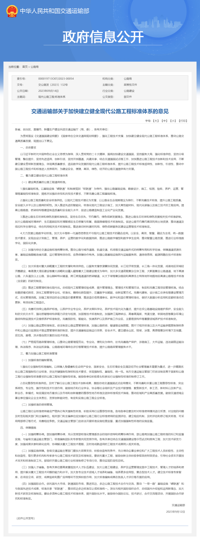 央視網(wǎng)消息:交通運輸部發(fā)布關(guān)于加快建立健全現(xiàn)代公路工程標準體系的意見。其中提出,大力發(fā)展公路數(shù)字化標準。加大北斗等新一代通信信息技術(shù)與現(xiàn)代公路工程技術(shù)的融合應(yīng)用。以安全、高效、智慧、融合為主線,統(tǒng)一數(shù)據(jù)技術(shù)要求,實現(xiàn)由設(shè)計到施工、管理、養(yǎng)護、運營的數(shù)字化和數(shù)據(jù)流轉(zhuǎn),推進公路數(shù)字模型和數(shù)字孿生應(yīng)用,推動智慧公路發(fā)展,推進行業(yè)標準數(shù)字化、國際化共享。