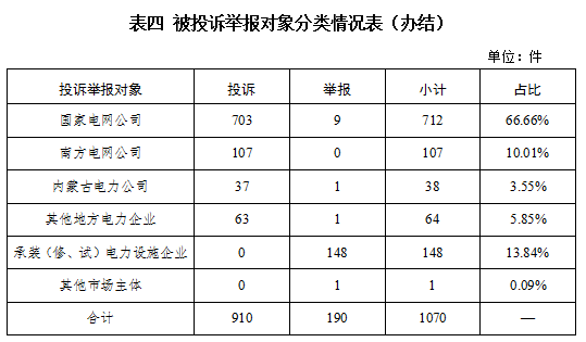 從被投訴舉報(bào)對(duì)象看,供電企業(yè)921件、占投訴舉報(bào)總數(shù)的86.07%,其中國(guó)家電網(wǎng)公司712件、占比66.66%,南方電網(wǎng)公司107件、占比10.01%,內(nèi)蒙古電力公司38件、占比3.55%,其他地方電力企業(yè)64件、占比5.85%;承裝(修、試)電力設(shè)施企業(yè)148件、占比13.84%;其他市場(chǎng)主體1件、占比0.09%。