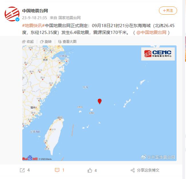 中國地震臺網正式測定:09月18日21時21分在東海海域(北緯26.45度,東經125.35度)發(fā)生6.4級地震,震源深度170千米。