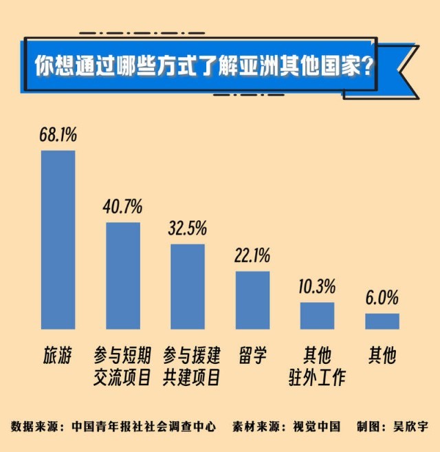 你會通過什么方式了解亞洲?68.1%的受訪者選擇了旅游,40.7%的受訪者選擇參與短期交流項目,32.5%的受訪者選擇參與援建共建項目,其他還有留學(xué)(22.1%)、駐外工作(10.3%)。