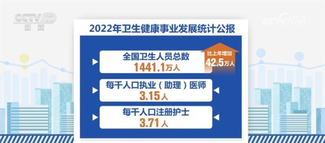 《公報》顯示,我國醫(yī)療衛(wèi)生資源總量繼續(xù)增加。到2022年末,全國醫(yī)療衛(wèi)生機構達到1032918個,比上年增加1983個。全國共設置13個類別的國家醫(yī)學中心和兒童類別的國家區(qū)域醫(yī)療中心。全國醫(yī)療衛(wèi)生機構床位975.0萬張,每千人口醫(yī)療衛(wèi)生機構床位數(shù)由2021年的6.70張增加到2022年的6.92張。全國衛(wèi)生人員總數(shù)1441.1萬人,比上年增加42.5萬人。每千人口執(zhí)業(yè)(助理)醫(yī)師3.15人,每千人口注冊護士3.71人。
