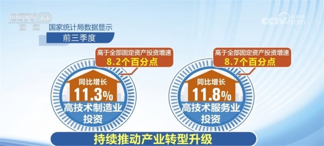 高技術(shù)產(chǎn)業(yè)投資動力強勁,新動能領(lǐng)域保持較快增長。國家統(tǒng)計局?jǐn)?shù)據(jù)顯示,前三季度,高技術(shù)制造業(yè)投資和高技術(shù)服務(wù)業(yè)投資分別同比增長11.3%和11.8%,分別高于全部固定資產(chǎn)投資增速8.2和8.7個百分點,持續(xù)推動產(chǎn)業(yè)轉(zhuǎn)型升級。規(guī)模以上高技術(shù)制造業(yè)中的航空、航天器及設(shè)備制造業(yè)增加值同比增長18.9%,增速高于全部規(guī)模以上工業(yè)增加值14.9個百分點。