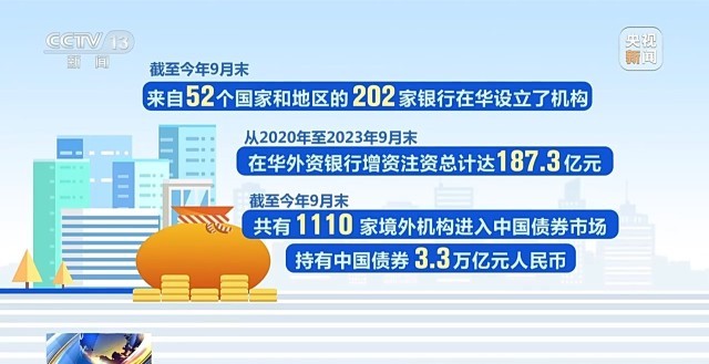 金融開(kāi)放步伐加快。截至今年9月末,來(lái)自52個(gè)國(guó)家和地區(qū)的202家銀行在華設(shè)立了機(jī)構(gòu);從2020年至2023年9月末,在華外資銀行增資注資總計(jì)達(dá)187.3億元。截至今年9月末,共有1110家境外機(jī)構(gòu)進(jìn)入中國(guó)債券市場(chǎng),持有中國(guó)債券3.3萬(wàn)億元人民幣。