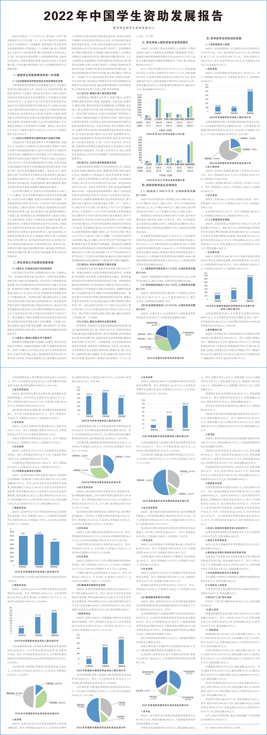 2022年是黨的二十大召開之年,是實施“十四五”規(guī)劃綱要承上啟下的關(guān)鍵一年。在習(xí)近平新時代中國特色社會主義思想指引下,各級教育、財政等部門和各級各類學(xué)校緊緊圍繞學(xué)習(xí)貫徹黨的二十大精神主線,深入貫徹落實以人民為中心的發(fā)展思想,著力促進教育公平和社會公平,進一步完善學(xué)生資助政策,大力推進精準(zhǔn)資助,全面深化資助育人,持續(xù)加強規(guī)范管理,推動學(xué)生資助工作高質(zhì)量發(fā)展,為加快建設(shè)教育強國、辦好人民滿意的教育作出積極貢獻。