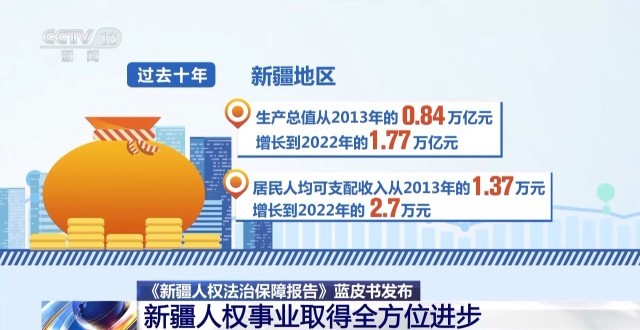 會議期間,還舉行了《新疆人權法治保障報告》藍皮書揭幕儀式。過去十年,新疆地區(qū)生產(chǎn)總值從2013年的0.84萬億元增長到2022年的1.77萬億元,居民人均可支配收入從2013年的1.37萬元增長到2022年的2.7萬元。