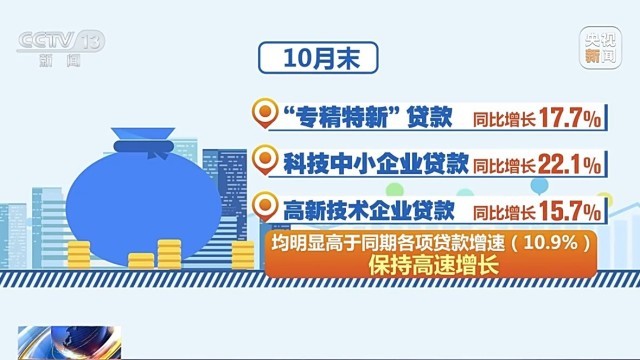 數(shù)據(jù)顯示,目前我國(guó)科技創(chuàng)新、制造業(yè)、綠色發(fā)展、普惠小微等重點(diǎn)領(lǐng)域貸款增量和占比都在明顯上升。10月末,“專(zhuān)精特新”、科技中小企業(yè)、高新技術(shù)企業(yè)貸款分別同比增長(zhǎng)17.7%、22.1%、15.7%,均明顯高于同期各項(xiàng)貸款增速,保持高速增長(zhǎng)。