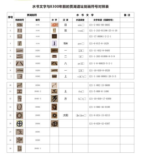 中國貴州省黔南布依族苗族自治州水書申報《世界記憶遺產(chǎn)名錄》領(lǐng)導(dǎo)小組辦公室、黔南州檔案館最新研究發(fā)現(xiàn),中國水書文字與中國河南省偃師市二里頭夏都遺址出土的24個刻畫符號相同,與中國浙江省良渚文化遺址出土的700多個刻畫符號中的104個符號相同,與中國安徽省蚌埠市雙墩遺址出土的600多個刻畫符號中的73個符號相同,與中國河南省賈湖遺址出土的19個刻畫符號中的16個符號相同。