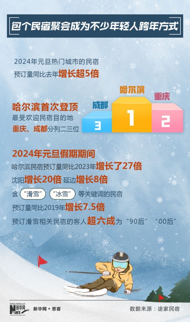 2024年元旦,民宿成為冰雪旅游一大熱詞。2024年元旦熱門城市的民宿,預(yù)訂量同比2023年增長(zhǎng)超5倍。北方民宿更是強(qiáng)勢(shì)崛起,哈爾濱首次登頂最受歡迎民宿目的地。
