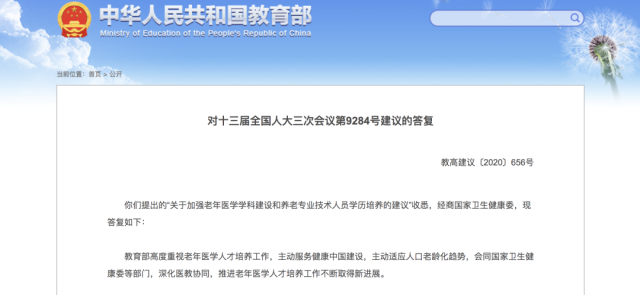 早在2021年,教育部官網(wǎng)曾公布《對(duì)十三屆全國(guó)人大三次會(huì)議第9284號(hào)建議的答復(fù)》,下一步,教育部將進(jìn)一步加強(qiáng)面向全體醫(yī)學(xué)類專業(yè)學(xué)生開(kāi)展老年醫(yī)學(xué)教育,同時(shí),協(xié)同國(guó)家衛(wèi)生健康委,鼓勵(lì)高校加強(qiáng)老年醫(yī)學(xué)學(xué)科建設(shè)、推進(jìn)老年醫(yī)學(xué)專科醫(yī)師規(guī)范化培訓(xùn)。