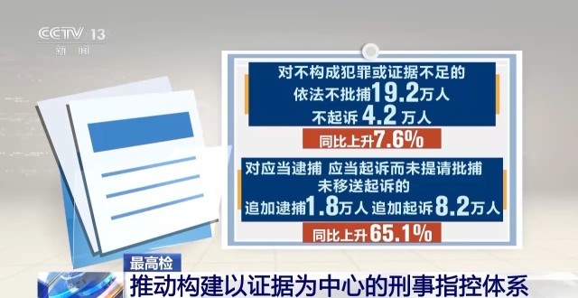 對(duì)不構(gòu)成犯罪或證據(jù)不足的依法不批捕19.2萬人、不起訴4.2萬人;對(duì)應(yīng)當(dāng)逮捕、應(yīng)當(dāng)起訴而未提請(qǐng)批捕、未移送起訴的,追加逮捕1.8萬人、追加起訴8.2萬人,同比分別上升7.6%和65.1%。