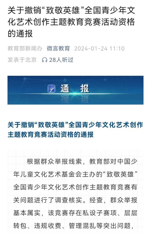 教育部1月24日通報,根據(jù)群眾舉報線索,教育部對中國少年兒童文化藝術(shù)基金會主辦的“致敬英雄”全國青少年文化藝術(shù)創(chuàng)作主題教育競賽有關(guān)問題進行了調(diào)查核實。經(jīng)查,群眾舉報基本屬實,該競賽存在私設(shè)子賽項、層層轉(zhuǎn)包、違規(guī)收費、管理混亂等突出問題,在社會上造成了惡劣影響。