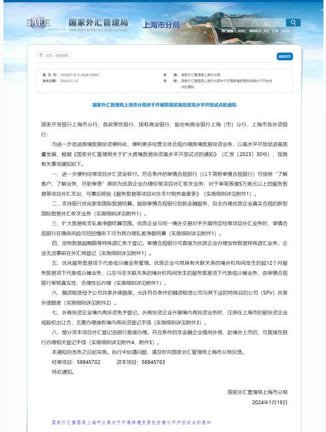 央視網(wǎng)消息:1月23日,國(guó)家外匯管理局上海市分局發(fā)布《關(guān)于開(kāi)展跨境貿(mào)易投資高水平開(kāi)放試點(diǎn)的通知》。