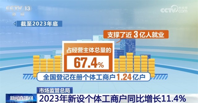 截至2023年底,全國登記在冊個體工商戶1.24億戶,占經(jīng)營主體總量的67.4%,支撐了近3億人就業(yè);全年新設個體工商戶2258.2萬戶,同比增長11.4%。