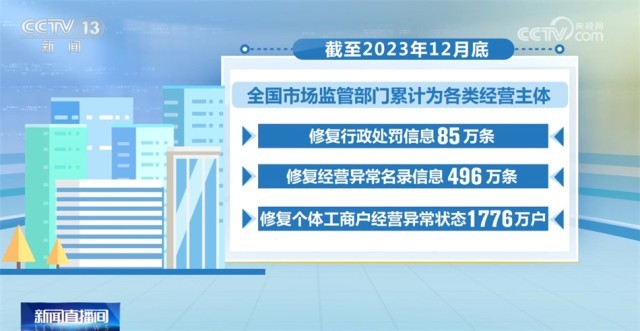 截至2023年12月底,全國市場監(jiān)管部門累計為各類經(jīng)營主體修復行政處罰信息85萬條,修復經(jīng)營異常名錄信息496萬條,修復個體工商戶經(jīng)營異常狀態(tài)1776萬戶。