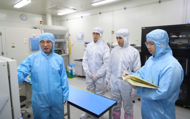 在位于沈陽市的中國科學院金屬研究所納米碳基電子器件超凈實驗室,孫東明(左一)與指導的研究生一起討論反應離子刻蝕工藝設備的使用方法和注意事項(2月24日攝)。