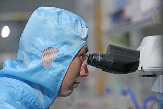 在位于沈陽市的中國科學院金屬研究所納米碳基電子器件超凈實驗室,孫東明在聚焦光學顯微鏡前觀測實驗樣品的形貌(2月24日攝)。