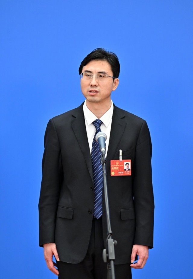 在第十四屆全國人民代表大會一次會議舉行的第二場“代表通道”采訪活動上,孫東明接受媒體采訪(2023年3月7日攝)。新華社記者 李鑫 攝