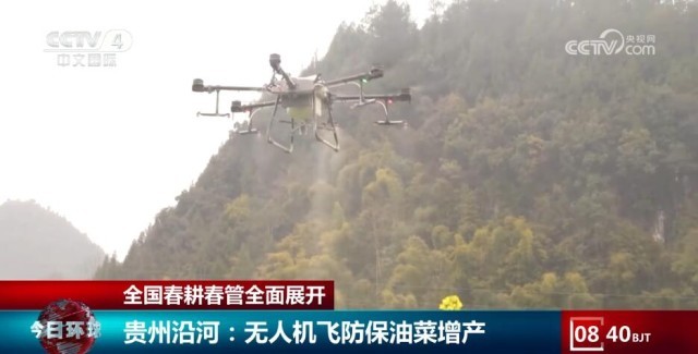 在貴州沿河,農(nóng)技人員組織專(zhuān)業(yè)飛手進(jìn)行無(wú)人機(jī)統(tǒng)防統(tǒng)治作業(yè),確保油菜增產(chǎn)增收。