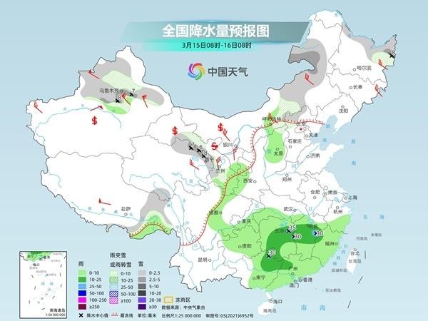后天,青海東部、甘肅、內蒙古東北部、川西高原北部、西藏東部等地部分地區(qū)有小雪或雨夾雪,局地有中雪。陜西中南部、山西中南部、黃淮西部、江淮西部、江漢、江南大部、西南地區(qū)東部、華南北部等地部分地區(qū)有小到中雨,其中,湖北南部、湖南北部、江西東北部、浙江西南部等地部分地區(qū)有大雨。