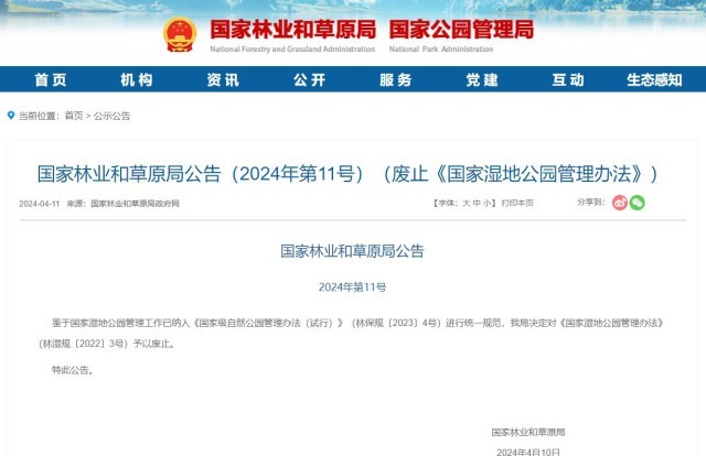 央視網(wǎng)消息:國(guó)家林業(yè)和草原局發(fā)布公告2024年第11號(hào),鑒于國(guó)家濕地公園管理工作已納入《國(guó)家級(jí)自然公園管理辦法(試行)》(林保規(guī)〔2023〕4號(hào))進(jìn)行統(tǒng)一規(guī)范,決定對(duì)《國(guó)家濕地公園管理辦法》(林濕規(guī)〔2022〕3號(hào))予以廢止。