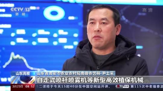 山東省高密市農(nóng)業(yè)農(nóng)村局高級農(nóng)藝師 尹士采:我們利用植保無人機、自走式噴桿噴霧機等新型高效植保機械,開展小麥病蟲草害統(tǒng)防統(tǒng)治,同時加強對農(nóng)戶、家庭農(nóng)場的指導服務。