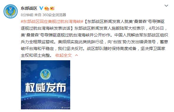 中新網(wǎng)4月27日電 據(jù)中國(guó)人民解放軍東部戰(zhàn)區(qū)官方微博消息,東部戰(zhàn)區(qū)新聞發(fā)言人27日就美“桑普森”號(hào)導(dǎo)彈驅(qū)逐艦過航臺(tái)灣海峽發(fā)表談話。東部戰(zhàn)區(qū)新聞發(fā)言人施毅陸軍大校表示,4月26日,美“桑普森”號(hào)導(dǎo)彈驅(qū)逐艦過航臺(tái)灣海峽并公開炒作。中國(guó)人民解放軍東部戰(zhàn)區(qū)組織兵力全程跟監(jiān)警戒。美頻頻實(shí)施此類挑釁行徑,向“臺(tái)獨(dú)”勢(shì)力發(fā)出錯(cuò)誤信號(hào),蓄意破壞臺(tái)海和平穩(wěn)定,我們堅(jiān)決反對(duì)。戰(zhàn)區(qū)部隊(duì)隨時(shí)保持高度戒備,堅(jiān)決捍衛(wèi)國(guó)家主權(quán)和領(lǐng)土完整。
