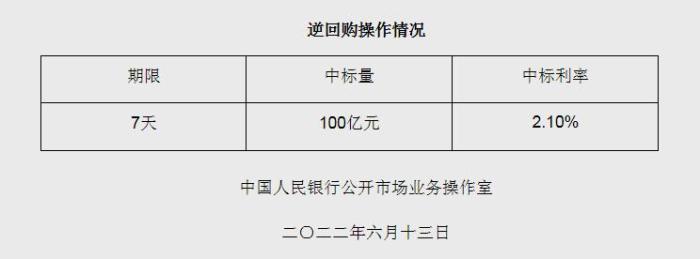 央行6月13日開展100億元逆回購操作 中標利率2.10%