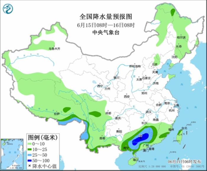 6月15日08時至16日08時,江南南部、華南中北部、云南西部、西藏東南部等地部分地區(qū)有中到大雨,其中,廣西東部、廣東北部等地部分地區(qū)有暴雨(50~90毫米)。