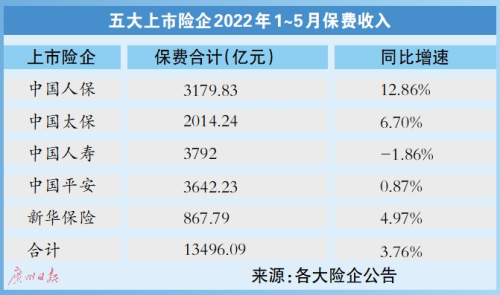 截至6月15日,A股包括中國人壽、中國平安、中國人保等在內的五大上市險企今年前5個月的保費收入全部出爐,合計取得保費收入約1.35萬億元,同比增長3.76%。