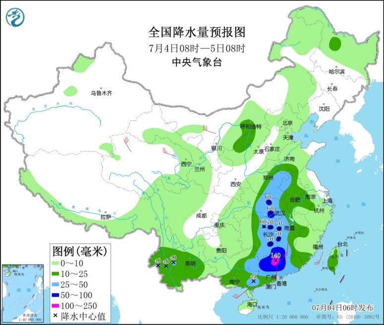 7月4日08時至5日08時,廣東大部、廣西東部、湖南中東部、江西西部和南部、湖北中部、河南東部等地部分地區(qū)有大到暴雨,其中,廣東北部等地部分地區(qū)有大暴雨(100~140毫米)。內(nèi)蒙古西部、甘肅西部、青海北部、東北地區(qū)南部、江南中部、華南東部等地的部分地區(qū)有4~6級風;東海北部海域有6~7級、陣風8級的旋轉風,東海南部海域、臺灣海峽、北部灣、南海北部和中部海域有5~6級、陣風7級的偏南到西南風。