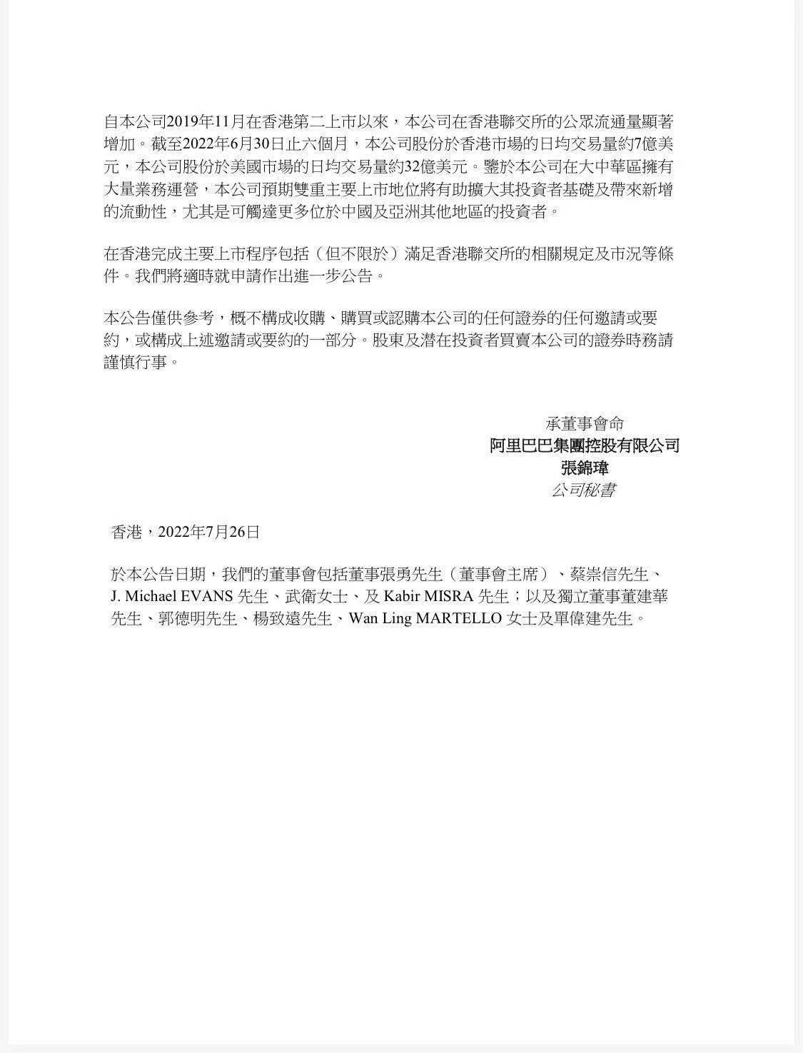 中新網7月26日電 阿里巴巴集團控股有限公司7月26日在港交所發(fā)布公告,董事會已授權公司管理層申請在香港聯交所主板改變上市地位為主要上市。