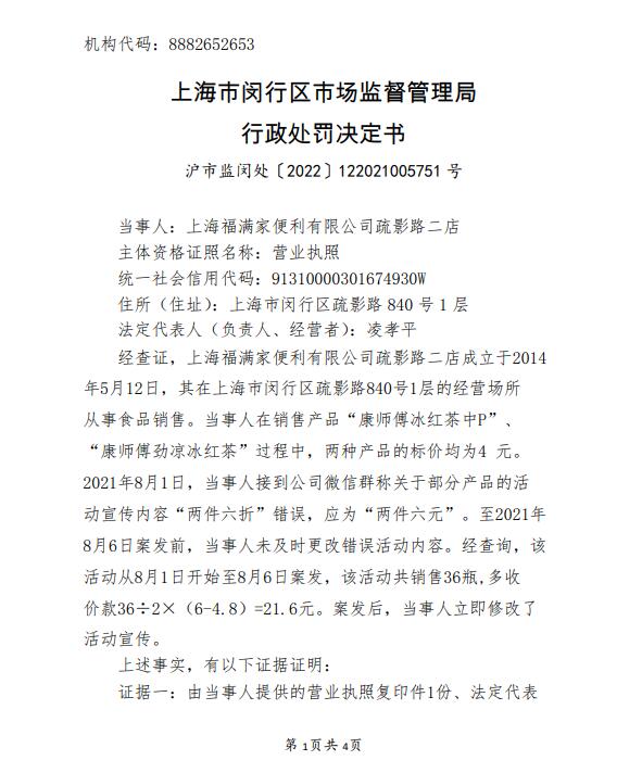 行政處罰決定書顯示,當事人在銷售冰紅茶時,兩種產(chǎn)品的標價均為4元。2021年8月1日,當事人接到公司微信群稱關于部分產(chǎn)品的活動宣傳內容“兩件六折”錯誤,應為“兩件六元”。至2021年8月6日案發(fā)前,當事人未及時更改錯誤活動內容。經(jīng)查詢,該活動從8月1日開始至8月6日案發(fā),該活動共銷售36瓶,多收價款36÷2×(6-4.8)=21.6元。案發(fā)后,當事人立即修改了活動宣傳。(中新財經(jīng))