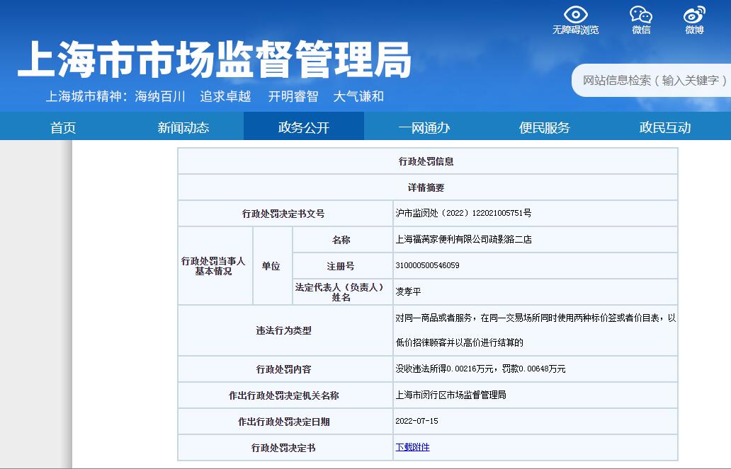 中新網(wǎng)7月27日電 上海市市場監(jiān)督管理局網(wǎng)站顯示,近日,上海福滿家便利有限公司疏影路二店,因對同一商品或者服務,在同一交易場所同時使用兩種標價簽或者價目表,以低價招徠顧客并以高價進行結算,被上海市閔行區(qū)市場監(jiān)督管理局沒收違法所得21.6元、罰款64.8元。