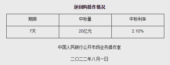 央行8月1日開(kāi)展20億元逆回購(gòu)操作 中標(biāo)利率2.10%