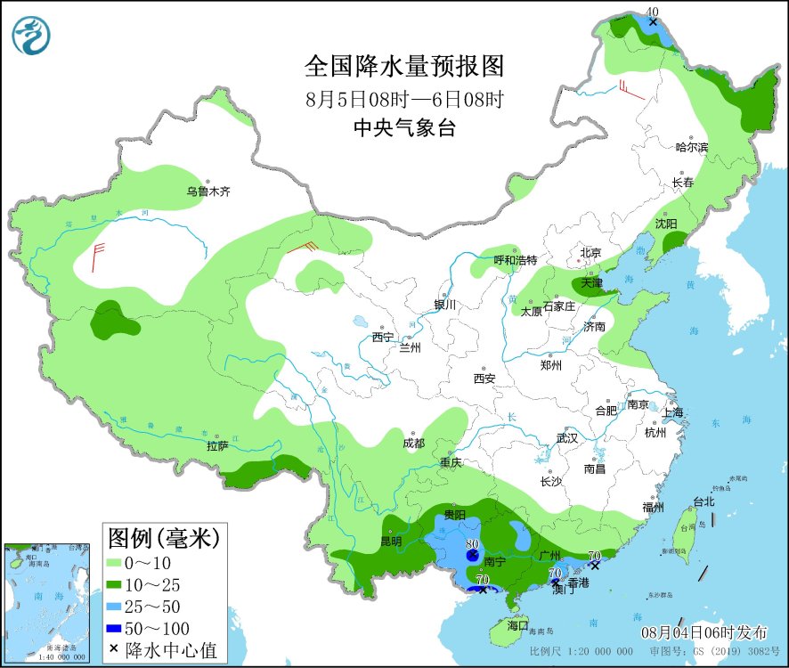 8月5日08時至6日08時,黑龍江北部、廣東中西部、廣西、貴州南部、云南中東部、西藏東南部等地部分地區(qū)有中到大雨,其中,廣東南部沿海、廣西西南部等地局部地區(qū)有暴雨(50~80毫米)。甘肅西部、內(nèi)蒙古東北部、新疆南疆盆地等地部分地區(qū)有4~6級風(fēng)。