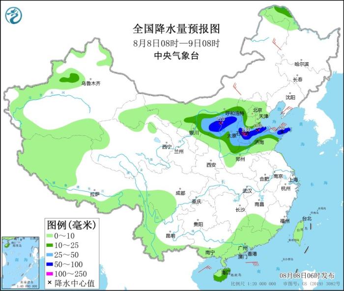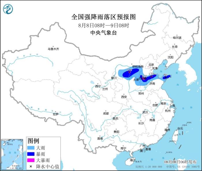 8月8日08時至9日08時,內(nèi)蒙古河套地區(qū)、陜西北部、山西北部和東部、河北中南部、山東北部等地的部分地區(qū)有大到暴雨,其中,陜西北部、河北南部、山東西北部等地局地有大暴雨(100~130毫米)。內(nèi)蒙古中東部、遼東半島、山東半島等地部分地區(qū)有4~5級風。