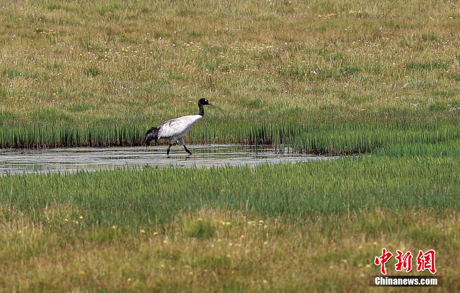8月9日,祁連山南麓的青海省海北藏族自治州祁連縣央隆鄉(xiāng),三只黑頸鶴正在央隆濕地悠閑踱步,不時(shí)發(fā)出鳴叫聲。黑頸鶴是大型飛行涉禽,頸的上部為黑色,故稱黑頸鶴。每年,黑頸鶴在春季遷徙到繁殖地,秋季到達(dá)越冬地,是世界上唯一生長(zhǎng)、繁殖在高原的鶴。圖為一只悠閑踱步的黑頸鶴。 賈天勇 攝