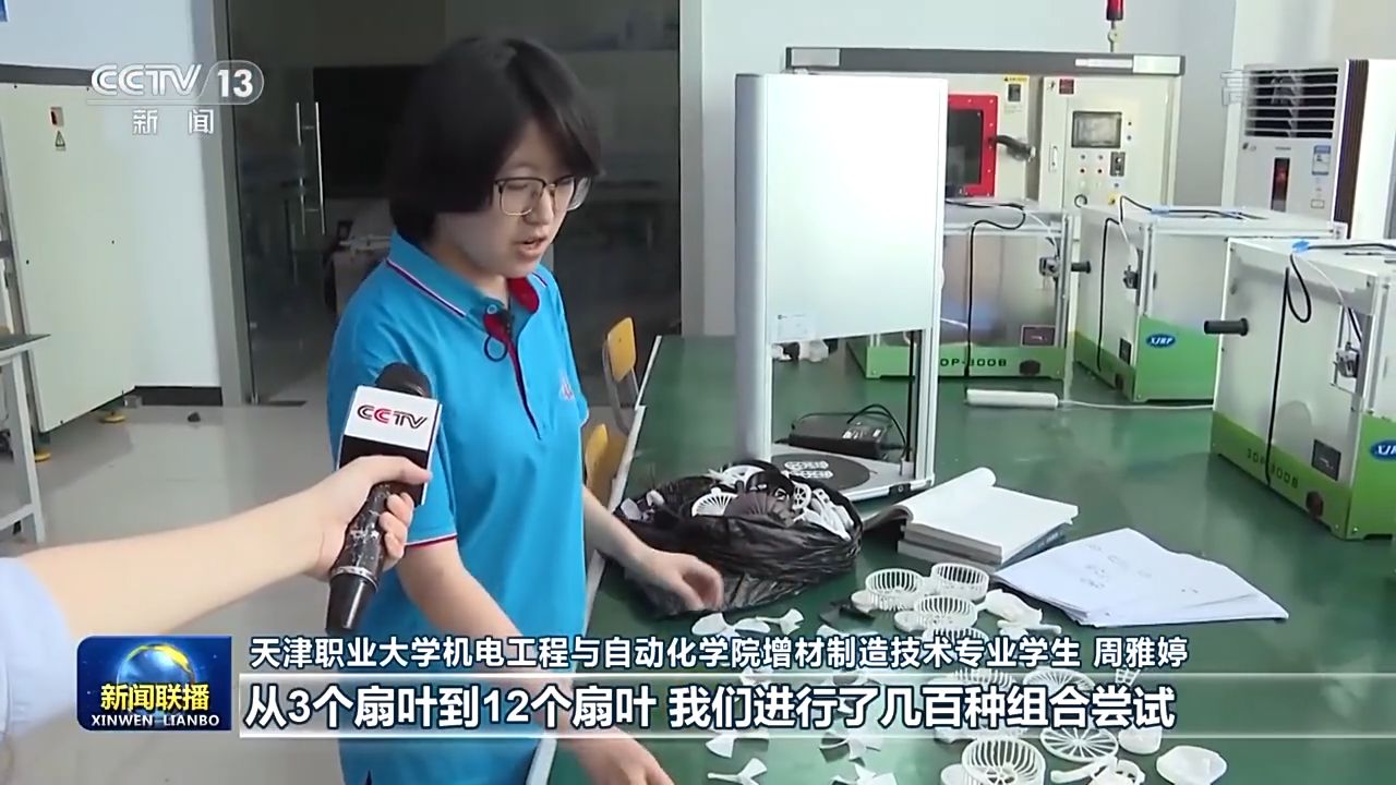 天津職業(yè)大學機電工程與自動化學院增材制造技術專業(yè)學生 周雅婷:這些都是我們通過3D打印打印出來的,從3個扇葉到12個扇葉,我們進行了幾百種組合嘗試。如果差0.1毫米的話,可能會導致風扇卡住。