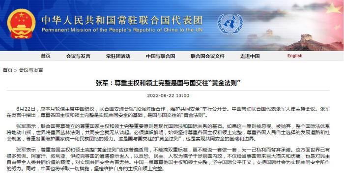 中新網(wǎng)8月23日電 據(jù)中國(guó)常駐聯(lián)合國(guó)代表團(tuán)網(wǎng)站消息,中國(guó)常駐聯(lián)合國(guó)代表張軍大使在聯(lián)合國(guó)安理會(huì)的公開會(huì)上指出,尊重各國(guó)主權(quán)和領(lǐng)土完整是實(shí)現(xiàn)共同安全的基礎(chǔ),是國(guó)與國(guó)交往的“黃金法則”。