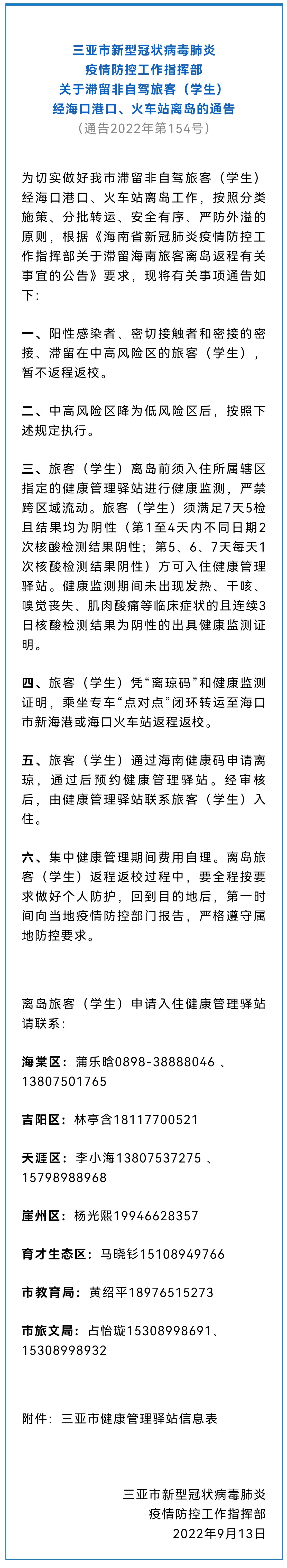 9月13日,總臺(tái)記者從三亞市新型冠狀病毒肺炎疫情防控工作指揮部獲悉,為切實(shí)做好三亞市滯留非自駕旅客(學(xué)生)經(jīng)??诟劭凇⒒疖囌倦x島工作,按照分類施策、分批轉(zhuǎn)運(yùn)、安全有序、嚴(yán)防外溢的原則,根據(jù)《海南省新冠肺炎疫情防控工作指揮部關(guān)于滯留海南旅客離島返程有關(guān)事宜的公告》要求,現(xiàn)將有關(guān)事項(xiàng)通告如下: