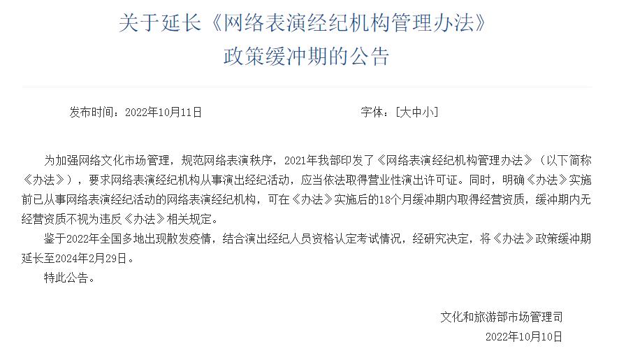 文旅部:延長《網(wǎng)絡(luò)表演經(jīng)紀(jì)機(jī)構(gòu)管理辦法》政策緩沖期