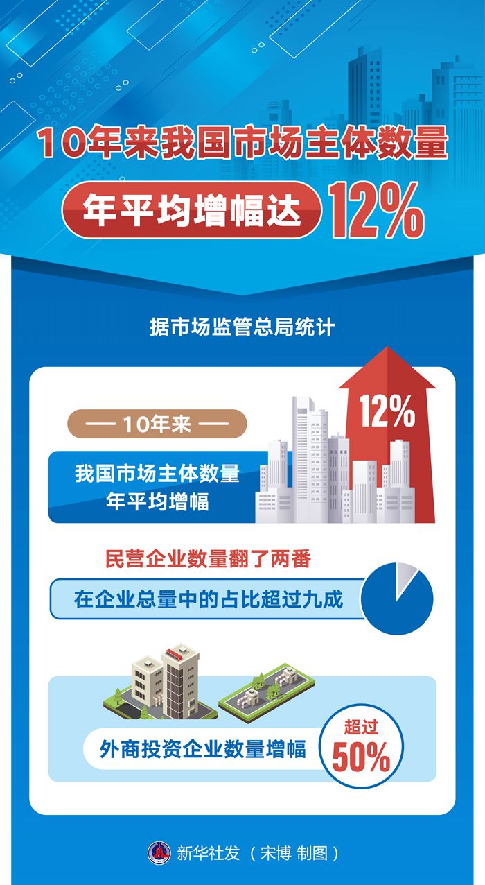 新華社北京10月13日電(記者趙文君)據(jù)市場監(jiān)管總局統(tǒng)計,10年來,我國市場主體數(shù)量年平均增幅達(dá)12%;民營企業(yè)數(shù)量翻了兩番,在企業(yè)總量中的占比超過九成;外商投資企業(yè)數(shù)量增幅超過50%。