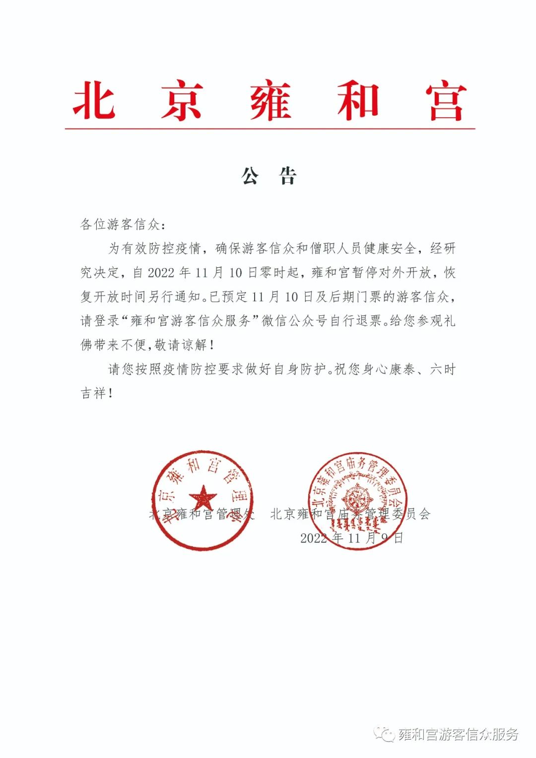 中新網(wǎng)11月9日電 據(jù)雍和宮游客信眾服務(wù)微信公眾號(hào)消息,為有效防控疫情,確保游客信眾和僧職人員健康安全,經(jīng)研究決定,自2022年11月10日零時(shí)起,雍和宮暫停對(duì)外開放,恢復(fù)開放時(shí)間另行通知。已預(yù)定11月10日及后期門票的游客信眾,請(qǐng)登錄“雍和宮游客信眾服務(wù)”微信公眾號(hào)自行退票。