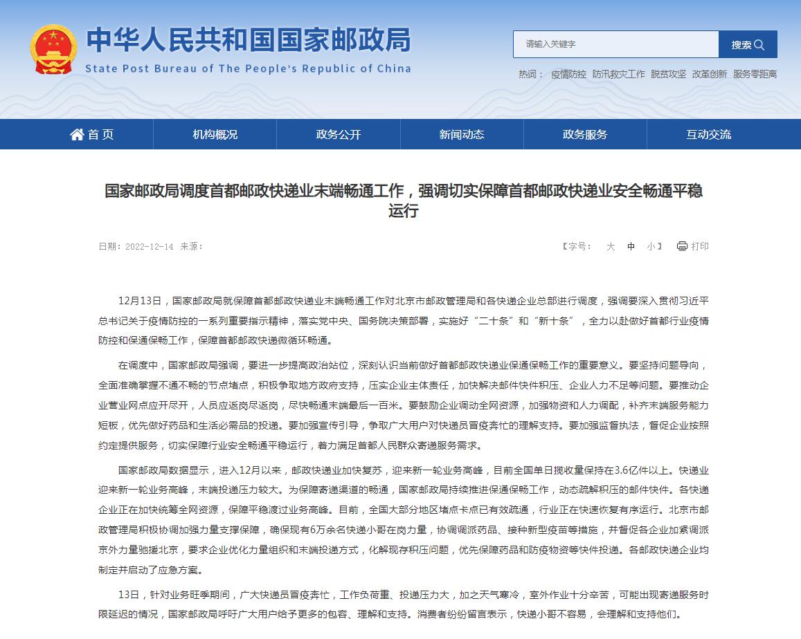 國家郵政局數(shù)據(jù)顯示,進入12月以來,郵政快遞業(yè)加快復蘇,迎來新一輪業(yè)務高峰,目前全國單日攬收量保持在3.6億件以上。快遞業(yè)迎來新一輪業(yè)務高峰,末端投遞壓力較大。為保障寄遞渠道的暢通,國家郵政局持續(xù)推進保通保暢工作,動態(tài)疏解積壓的郵件快件。各快遞企業(yè)正在加快統(tǒng)籌全網(wǎng)資源,保障平穩(wěn)渡過業(yè)務高峰。目前,全國大部分地區(qū)堵點卡點已有效疏通,行業(yè)正在快速恢復有序運行。北京市郵政管理局積極協(xié)調(diào)加強力量支撐保障,確?,F(xiàn)有6萬余名快遞小哥在崗力量,協(xié)調(diào)調(diào)派藥品、接種新型疫苗等措施,并督促各企業(yè)加緊調(diào)派京外力量馳援北京,要求企業(yè)優(yōu)化力量組織和末端投遞方式,化解現(xiàn)存積壓問題,優(yōu)先保障藥品和防疫物資等快件投遞。各郵政快遞企業(yè)均制定并啟動了應急方案。